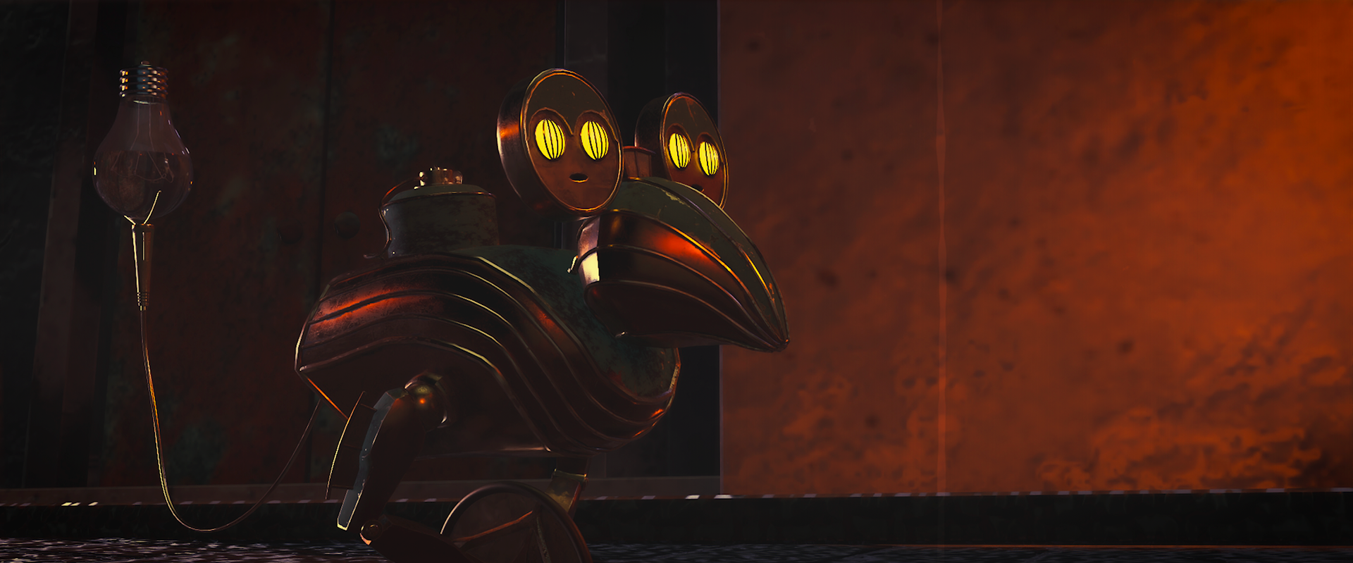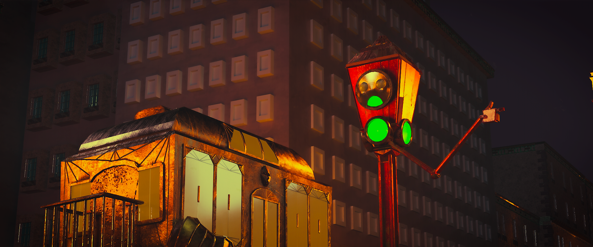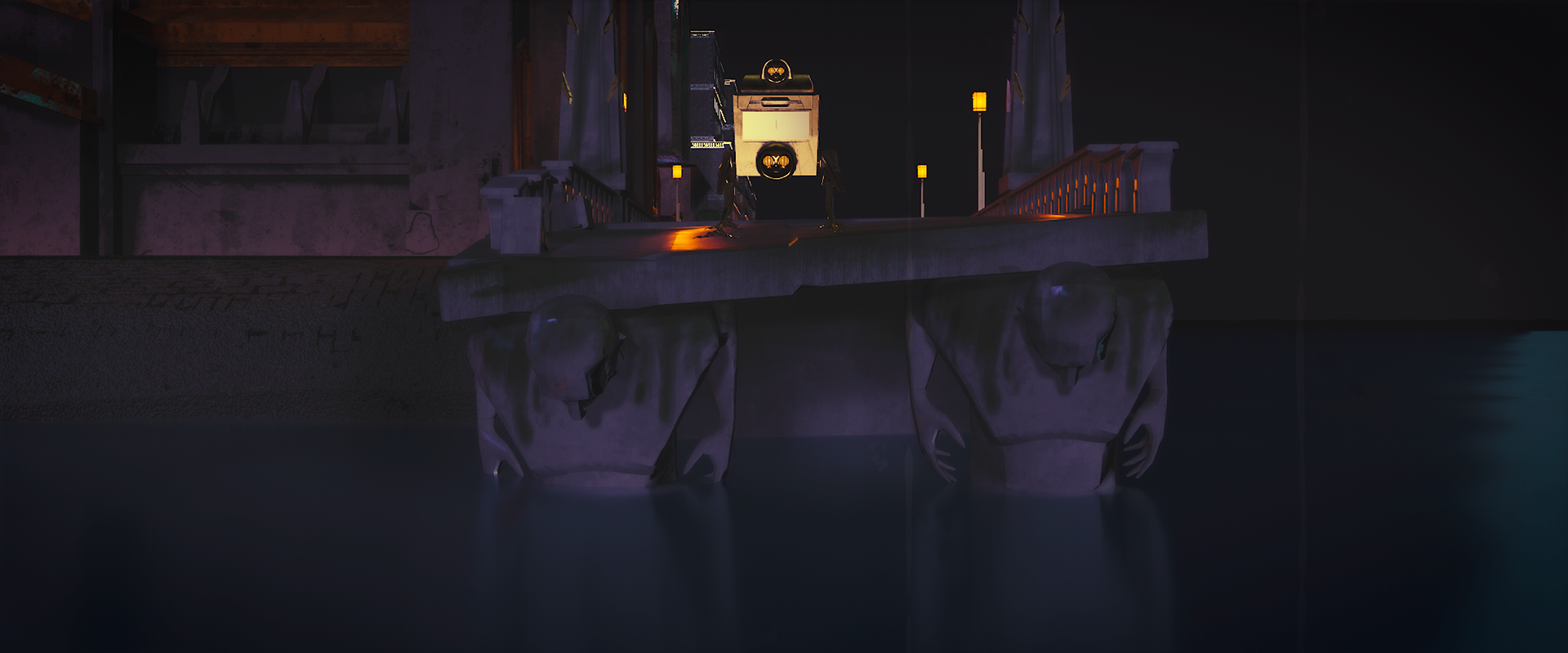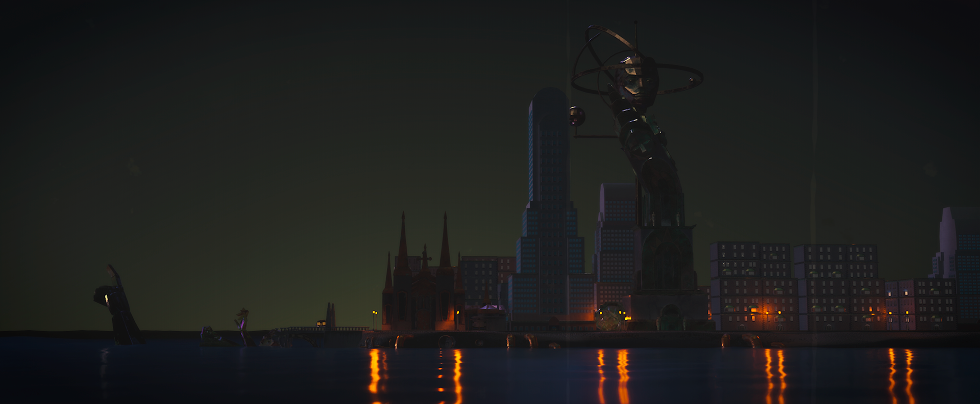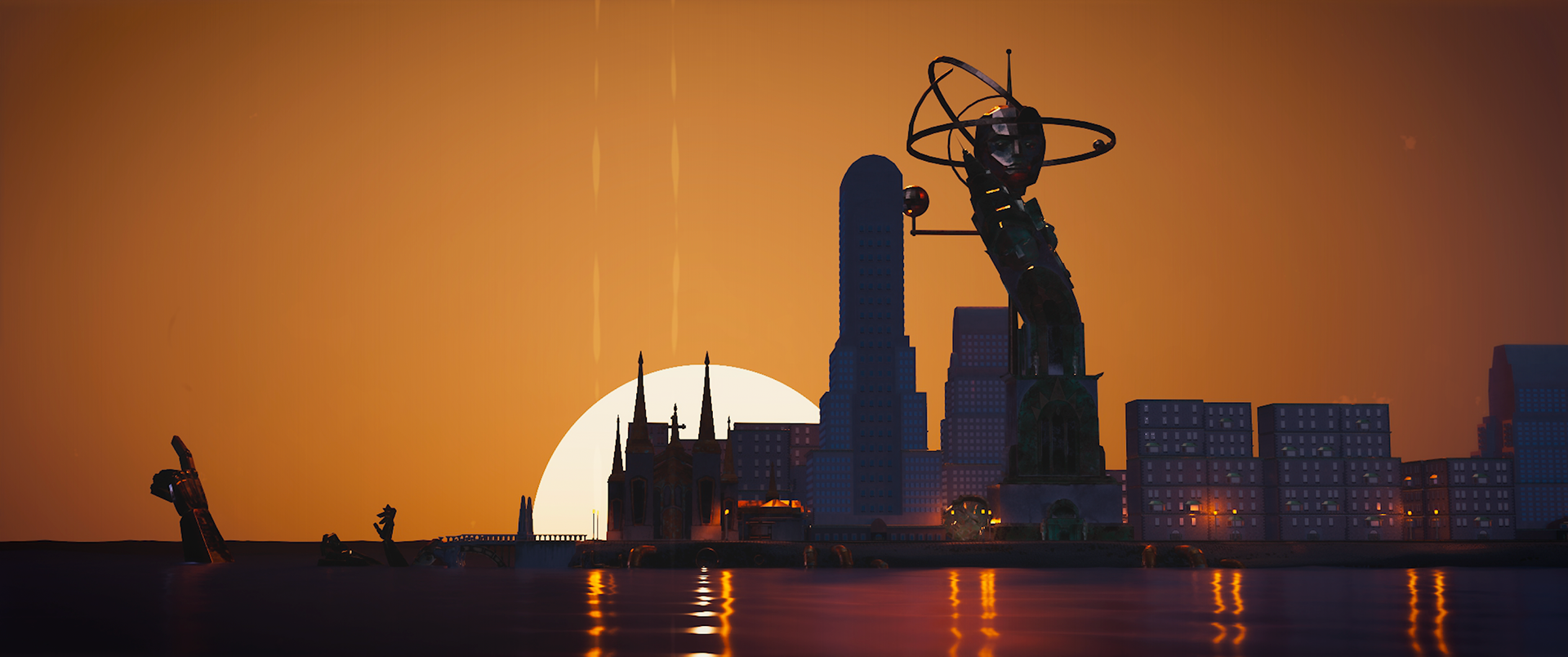 The story takes place in a city abandoned after severe inundations. Its architecture, a blend of art deco and retrofuturism, reflects human anthropocentrism and ostentation, with colossal human statues standing frozen in place, still claiming ownership of a world from which humanity has long disappeared. We follow a bus that continues its route with quiet persistence, alongside other robots left behind on the island, all strictly carrying out the purposes they were built for.