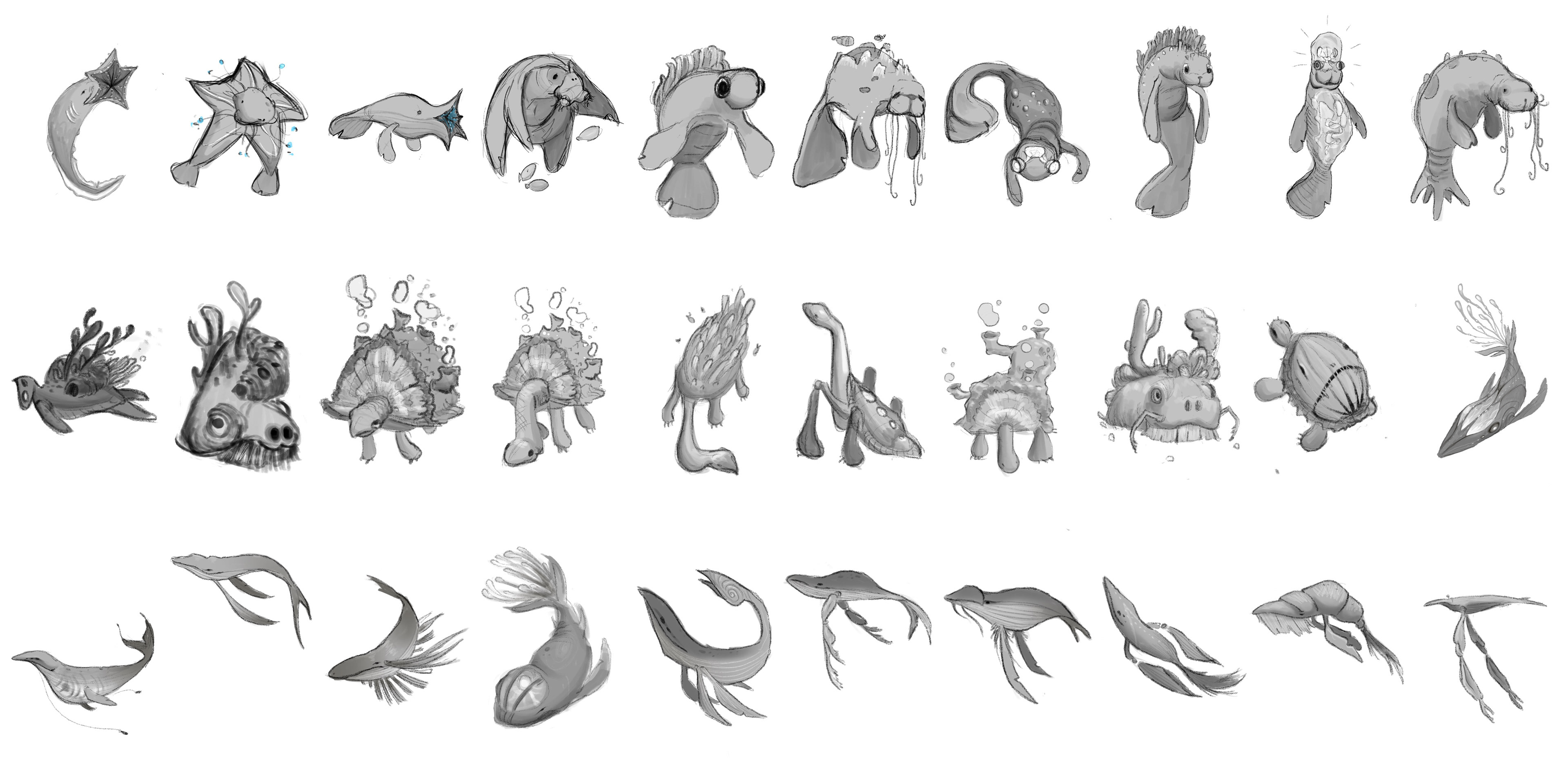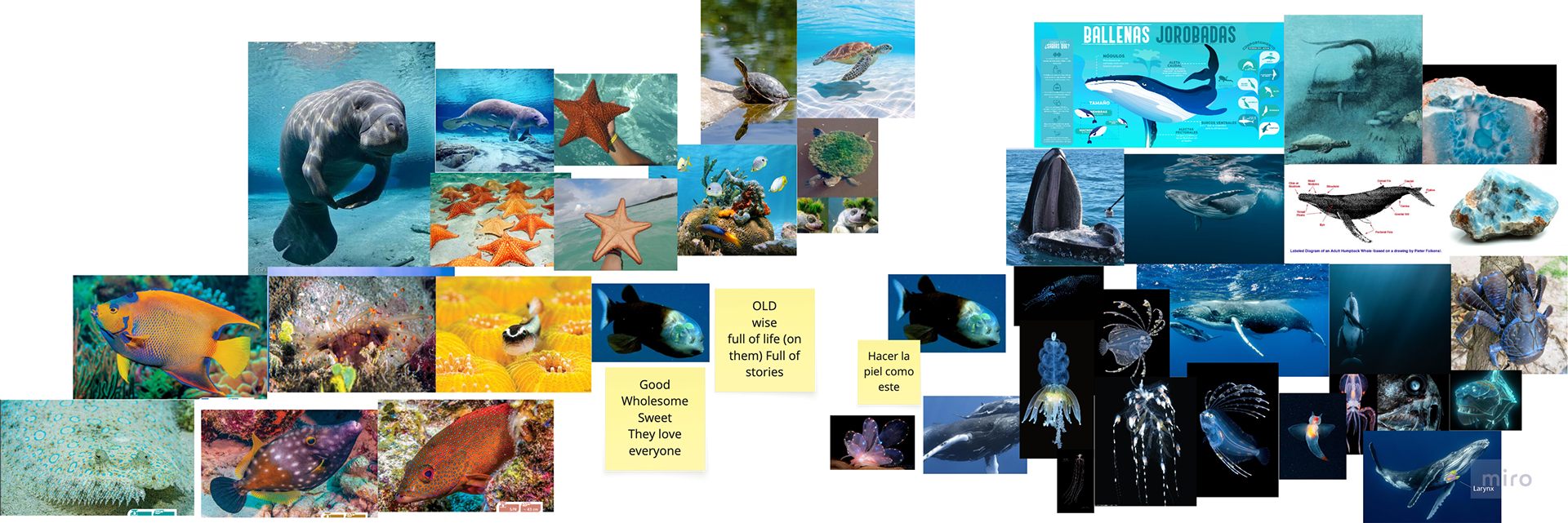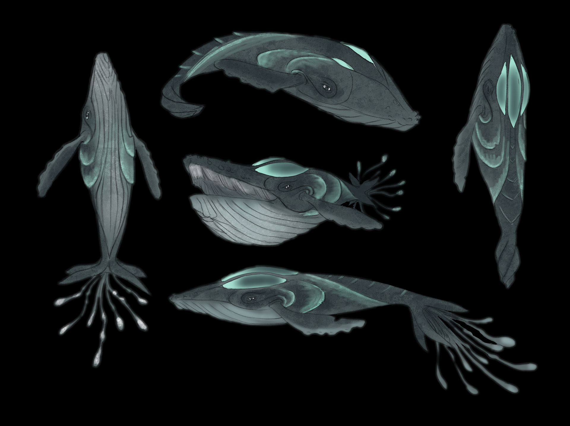 For the animal guide, I was inspired by Dominican sea animals such as the manatee, sea stars, sea turtles, and different whales. This, plus bioluminescence attributes inspired by real deep-sea creatures.