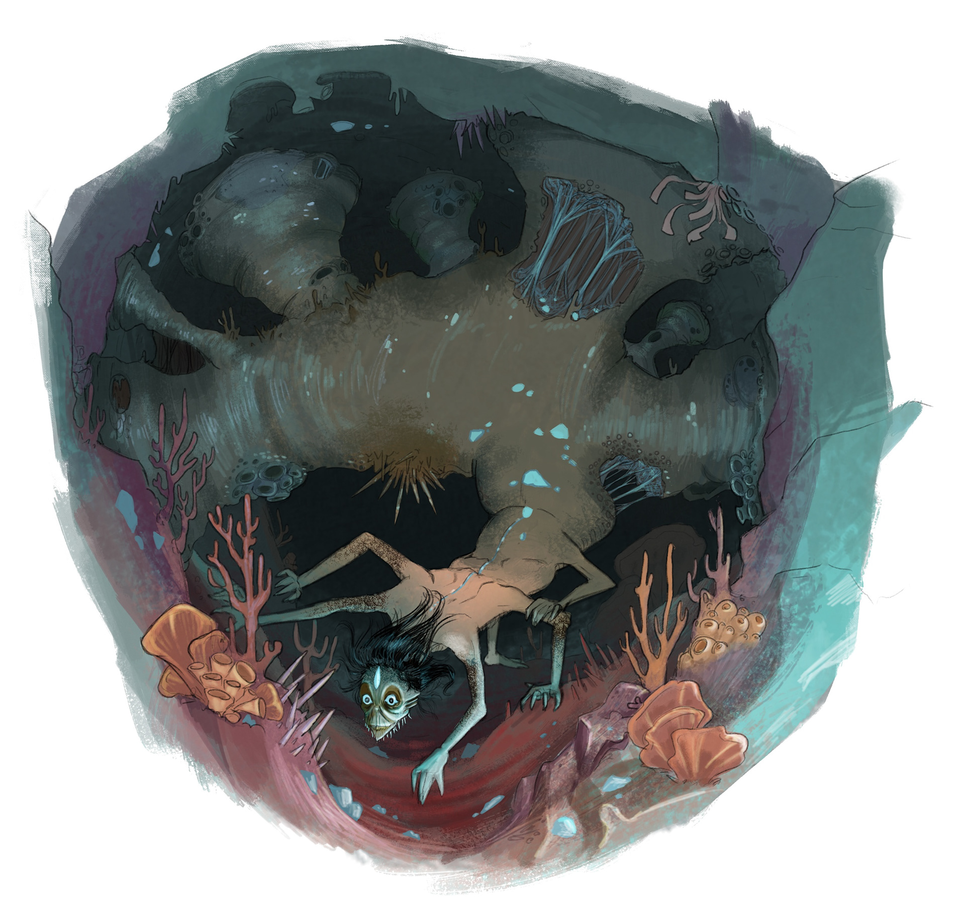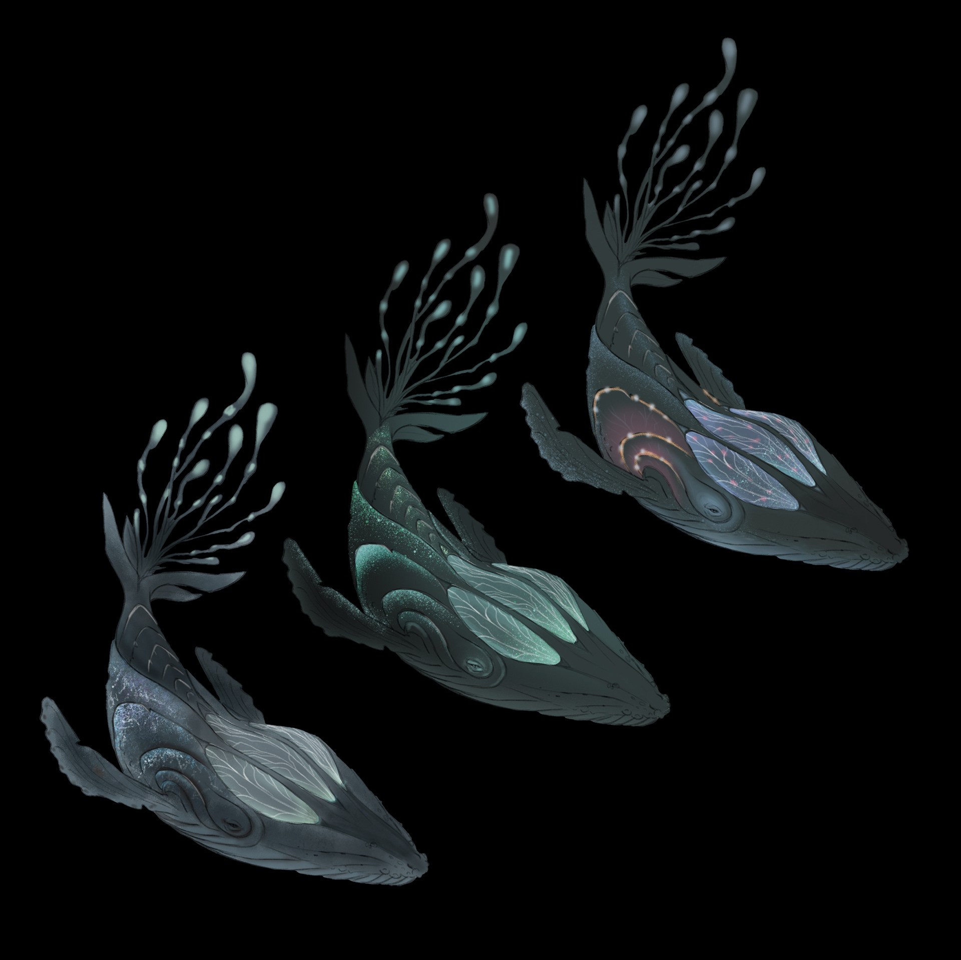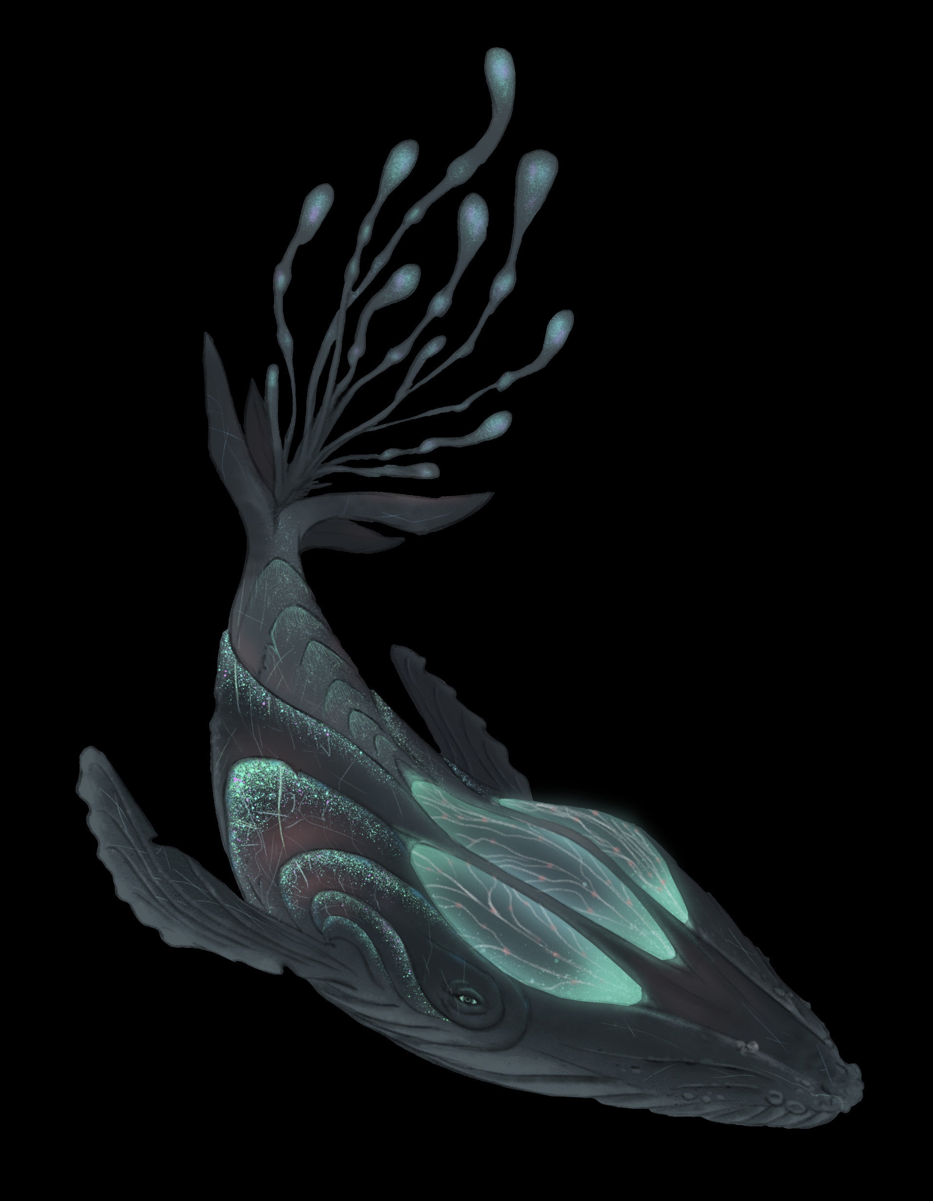 For the animal guide, I was inspired by Dominican sea animals such as the manatee, sea stars, sea turtles, and different whales. This, plus bioluminescence attributes inspired by real deep-sea creatures.
