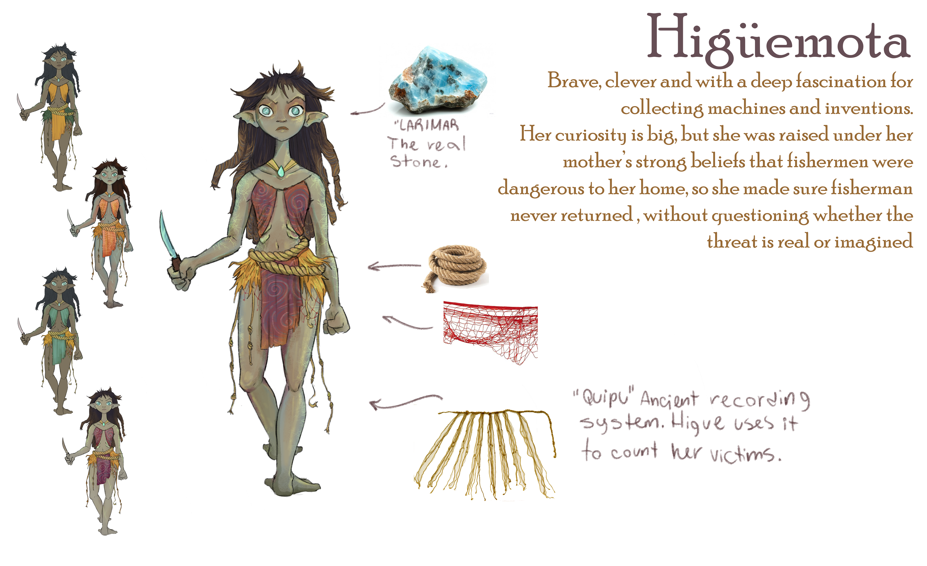 Higüemota is inspired by the Dominican Republic and Haitian folklore "La Ciguapa." She's a wild woman with long hair covering her body and backward-facing feet, leaving misleading tracks in the mountains where she lives, luring men into the woods to capture or bewitch them.
